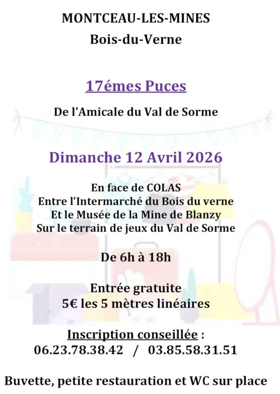 C’est la 17e édition des puces organisée par l’association du Val de Sorme au Bois du Verne à Montceau-les-Mines. Elles se tiendront dimanche 12 avril 2026 sur le terrain de jeu du Val de Sorme de 6h à 18h.