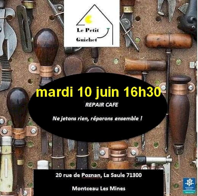 Au Petit Guichet : à jour de vos appareils en réparation ? Alors venez mardi 10 juin 2025 au 20 rue de Poznan à la Saule à Montceau-les-Mines où se déroulera un repair café à partir de 16h30.