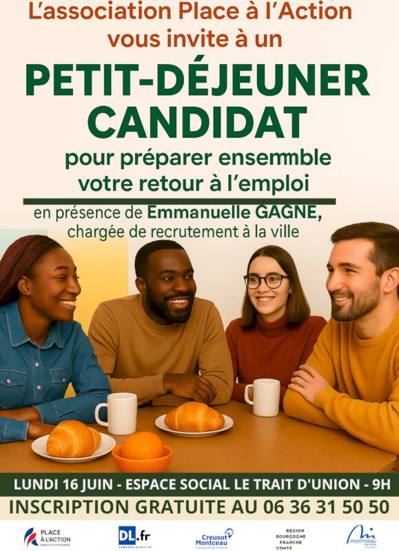 Rendez-vous lundi 16 juin 2025 à partir de 9h au Trait d’Union de Montceau-les-Mines où l’association Place à l’action proposera un petit-déjeuner candidat pour préparer un retour à l’emploi en présence d’Emmanuelle Gagne, chargée de recrutement à la ville de Montceau.