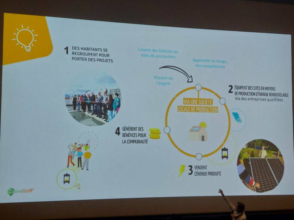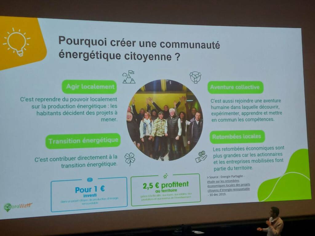 Cette première approche a laissé le maigre public dans l’expectative ne sachant pas très bien à quel saint se vouer. Faut il appartenir et investir dans cette coopérative citoyenne pour bénéficier d’une électricité à un tarif préférentiel ou suffira-t-il tout simplement d’en faire la demande, se brancher et le tour est joué ?