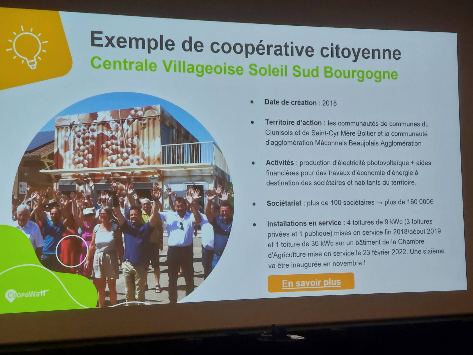 Des exemples dans la région prouvent qu’il est possible de mobiliser des citoyens. On peut citer la centrale Villageoise Soleil Sud Bourgogne qui agit sur le territoire des communautés de communes du Clunysois et de Saint-Cyr Mère Boitier ou encore la communauté d’agglomération du Mâconnais Beaujolais qui a été créée en 2018, elle produit de l’électricité photovoltaïque et propose des aides financières pour des travaux d’économie d’énergie à destination des sociétaires et habitants du territoire. Quatre toitures de 9 kWc ont été mises en service ainsi qu’une toiture de 36 kWc sur un bâtiment de la chambre d’agriculture en février 2022.
