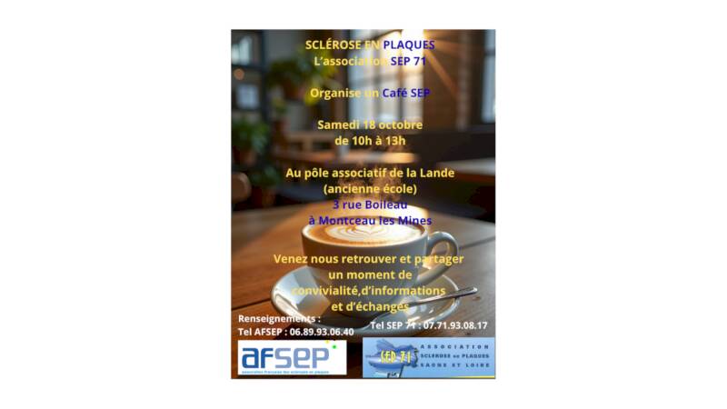 Une nouvelle rencontre entre les personnes touchées par la Sclérose En Plaques aura lieu le samedi 18 octobre 2025 à partir de 10 H, au Pole Associatif de la Lande, à Montceau sous forme d’un CAFE SEP, temps convivial de discussions autour de cette maladie aux multiples facettes.