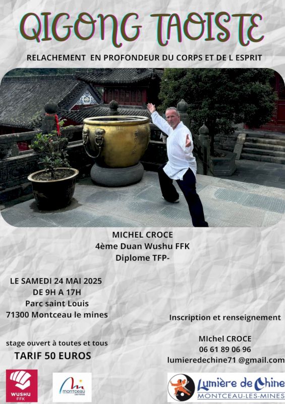 Si le coeur vous en dit, vous pourrez participer au stage de Qigong taoïste proposé par Lumière de Chine et son maître, Michel Croce, samedi 24 mai 2025 de 9h à 17 au parc Saint-Louis à Montceau-les-Mines.