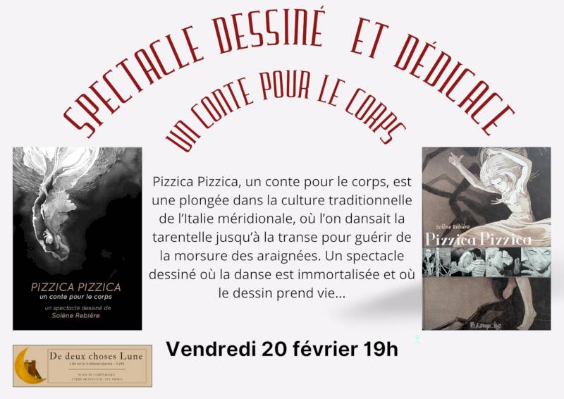 Le spectacle dessiné Pizzica Pizzica, un conte pour le corps, est le prolongement naturel de cette démarche, mais s’impose aussi comme une œuvre autonome. S’il conserve le dessin à l’encre de chine et le style réaliste de la bande dessinée Pizzica Pizzica, il s’émancipe de celle-ci en plaçant au centre de son propos non plus un personnage imaginaire, mais le phénomène anthropologique lui-même. Dans un registre onirique proche du conte et aux antipodes du ton parfois très cru du roman graphique, il propose un voyage à la découverte de la pizzica et de son histoire, depuis ses origines antiques jusqu’à son renouveau contemporain, en passant par son apogée médiévale et par son déclin dans la première moitié du XXème siècle.