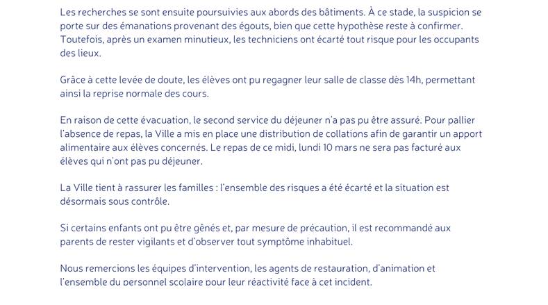 Aussitôt qu’une une odeur suspecte a été détectée par les agents au restaurant scolaire du Bois du Verne ce lundi à midi, les enfants ont rapidement été évacués et les secours alertés.