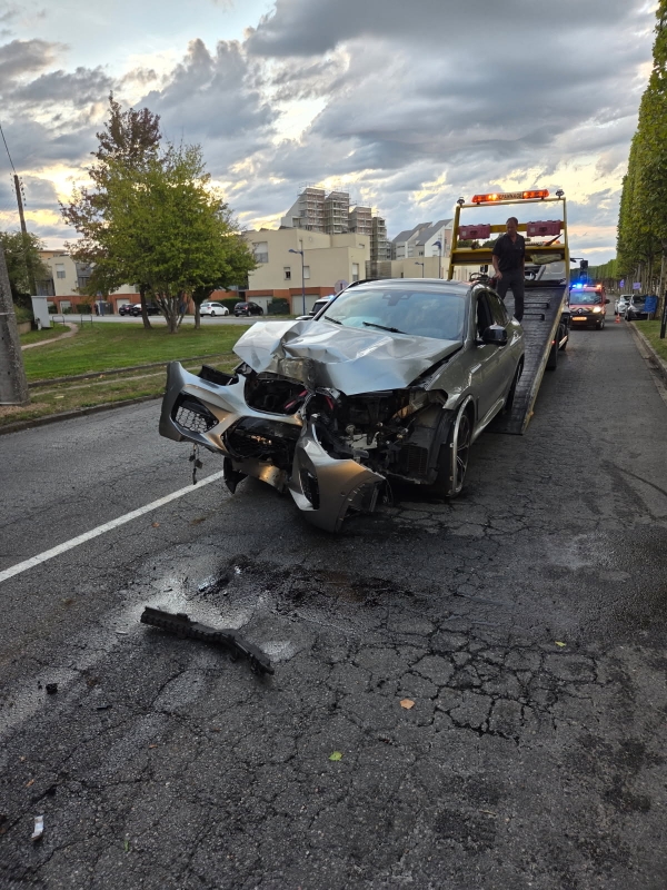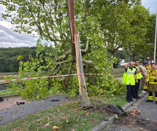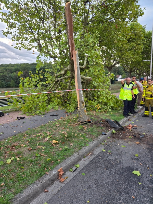 Une BMW qui venait de la route de Mâcon a pris à droite, boulevard de Tassigny en direction du Plessis mais, pour une raison indéterminée, le conducteur a perdu le contrôle de son véhicule qui a percuté un platane. Sous le choc, l’arbre s’est brisé en deux.