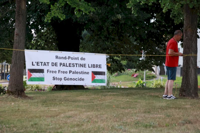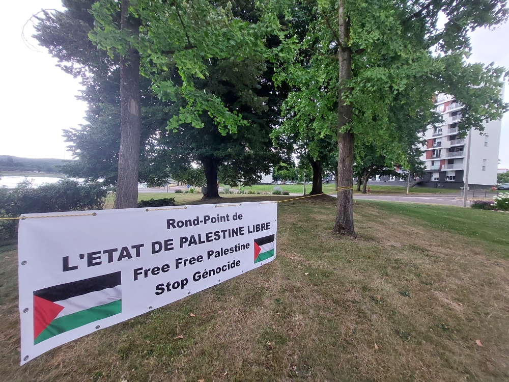 Une fois la manifestation terminée, quelques-uns se sont rendus au rond-point du Plessis pour y installer une banderole et le rebaptiser « Rond-point de l’État de Palestine libre« . Tout un symbole.