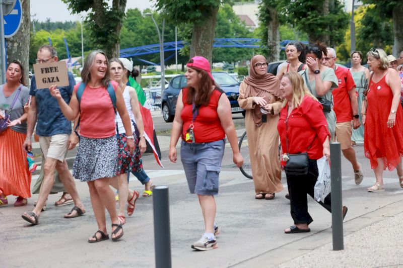 Cette fois-ci, entre 100 et 200 personnes ont entamé une marche rouge à travers les rues du centre-ville de Montceau. De retour devant la mairie, elles ont scandé le nom de la maire, « Jarrot« , reprochant à cette dernière de ne pas avoir souhaité soumettre au conseil municipal le vœu que lui avait adressé Christian Tramoy : « Trop politique », dit-elle. Allez dire cela aux plus de deux millions de Palestiniens qui nous demandent une seule chose : agir, agir pour qu’ils puissent vivre », déclare-t-il.