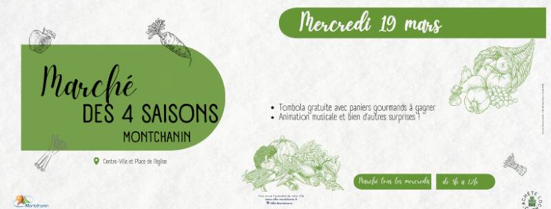 Mercredi 19 mars 2025 se tiendra le prochain marché des 4 saisons à Montchanin avec animation par Jordan à l’accordéon et tombola par tirage au sort permettant de remporté 3 paniers garnis composés des produits du marché.