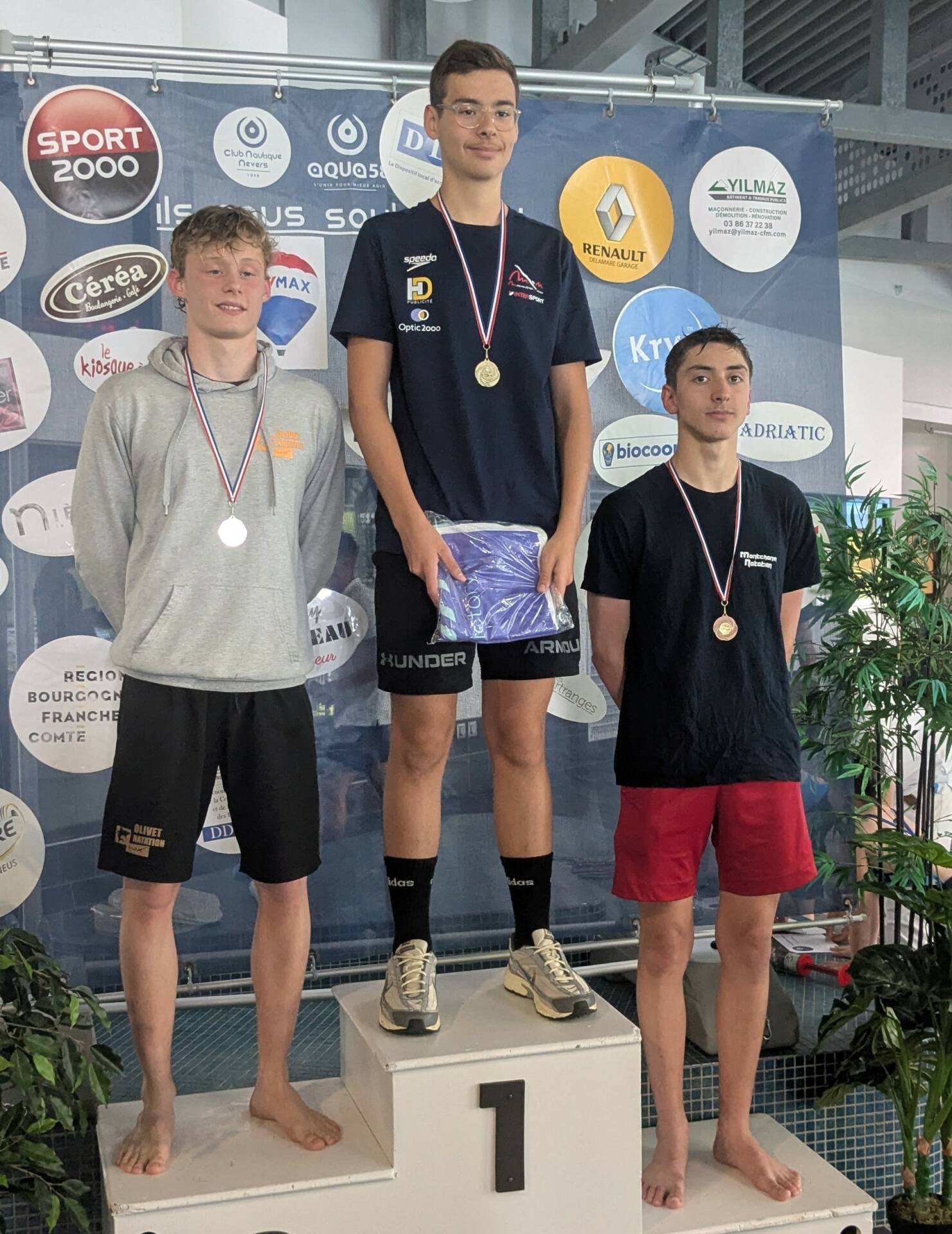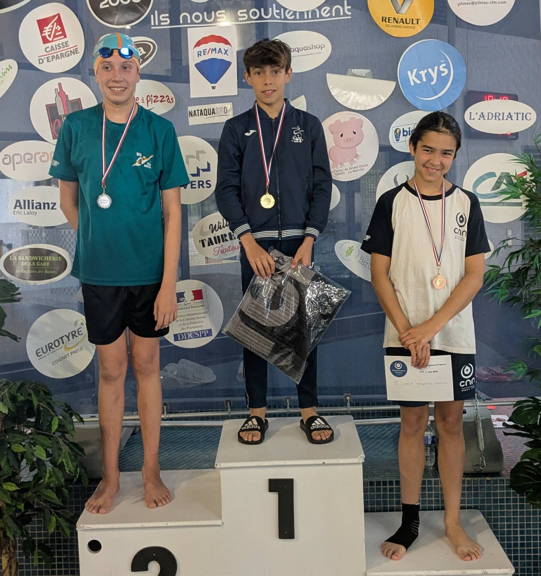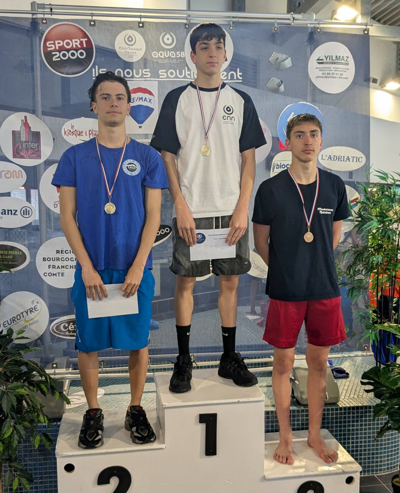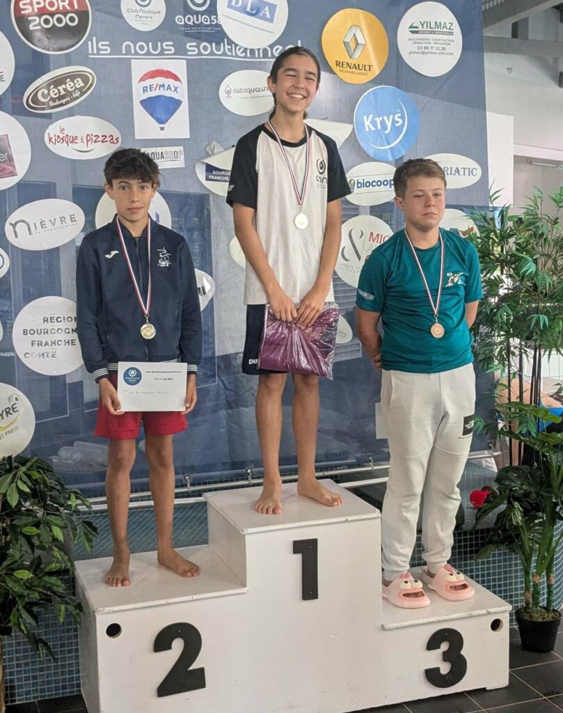 Antoine Jordan participe lui aussi à 5 finales sur 5 courses et monte 3 fois sur le podium en terminant 3ème sur 100m et 100nl (Junior 3 et plus) et 3ème sur 200m 4n (toutes catégories). Il établit un très bon chrono sur 200nl en 2’01″92.