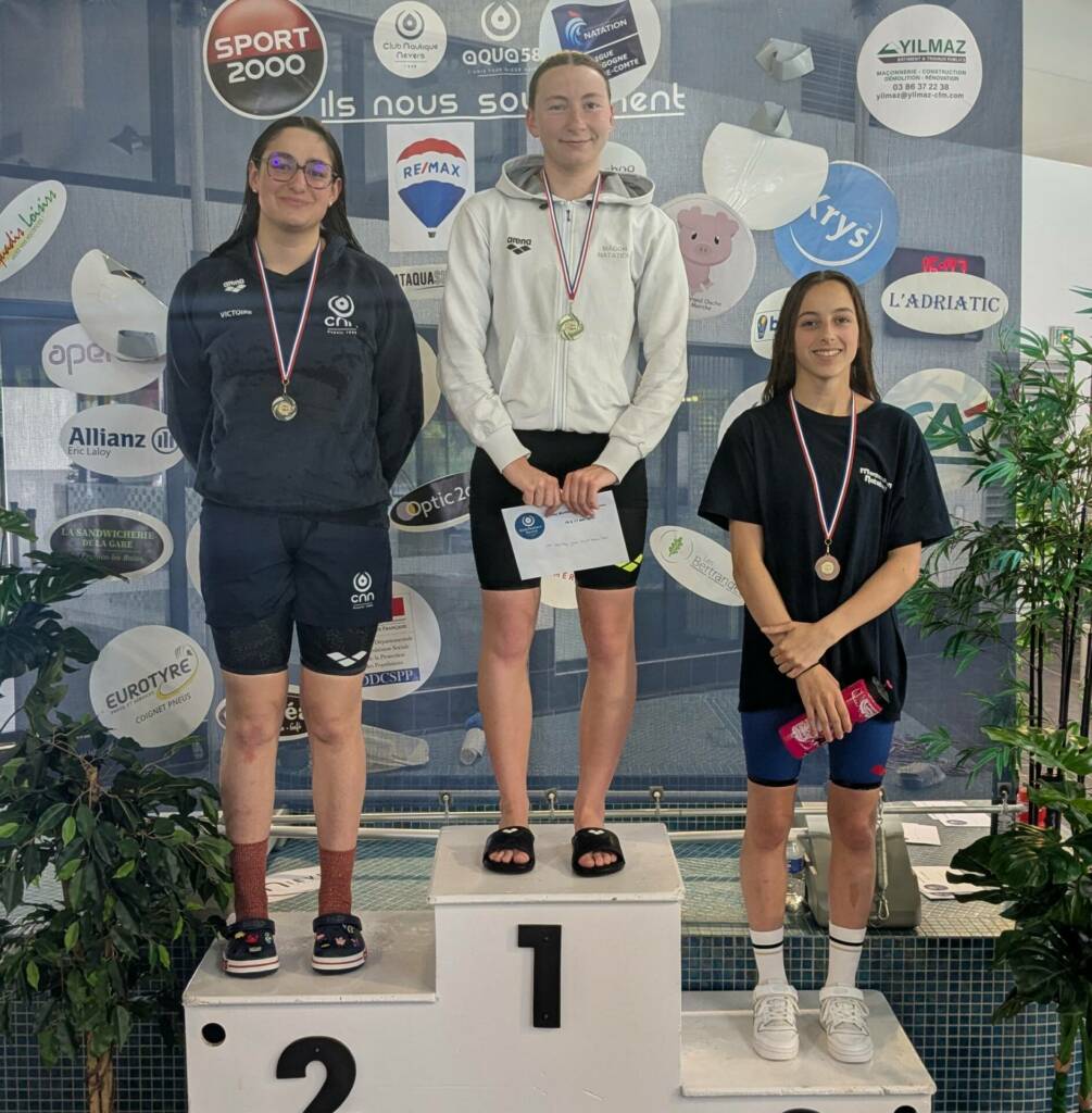 Lola Kermabon se qualifie sur 4 finales A (junior 3 et plus) sur 50m et 100m papillon ainsi que sur 100m et 200m nage libre. Elle termine 3ème sur le 100m papillon et prend une très belle 3ème place sur 200nl avec un très bon chrono de 2’16″60.
