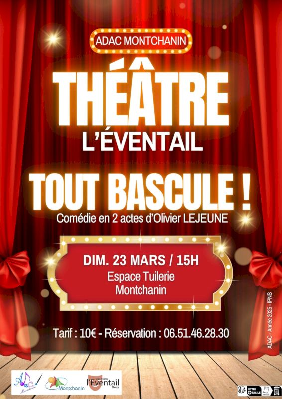 Dimanche 23 mars 2025, à 15h à l’espace Tuilerie à Montchanin, L’ADAC reçoit la troupe de l’Eventail de Blanzy avec leur pièce « Tout bascule », une comédie en deux actes d’Olivier Lejeune.