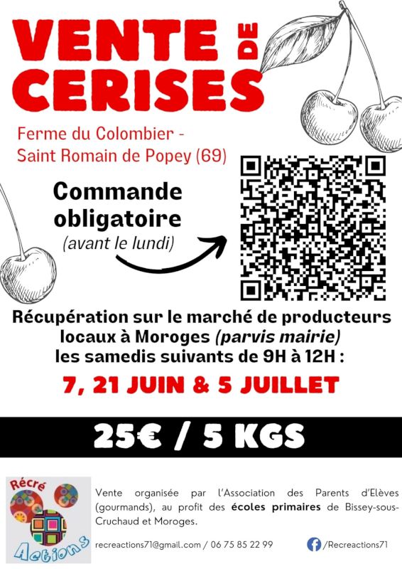 L’association des parents d’élèves _ gourmands _ organise des ventes de cerises au profits des écoles de Bissey-sous-Cruchaud et Moroges. La récupération des cerises a lieu sur le parvis de la mairie de Moroges.
