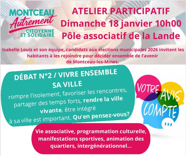 La liste « Montceau autrement citoyennes et solidaire » organise son deuxième atelier participatif et citoyen ce dimanche 18 janvier 2026 au pôle associatif de La Lande à partir de 10h.
