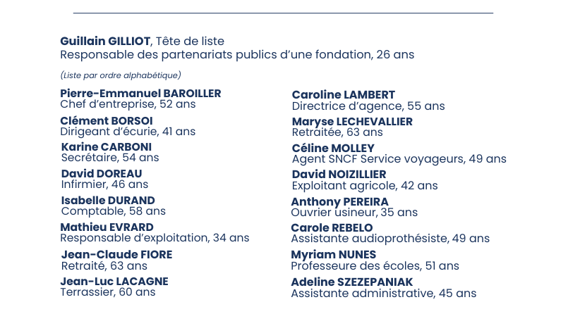 Cette liste ne repose pas sur une addition d’hommes et de femmes sans vision commune, mais sur un esprit fédérateur, fidèle à l’identité de Marmagne. Elle est prête à agir concrètement pour le quotidien des habitants, à être à leur écoute et à se mettre pleinement à leur service.