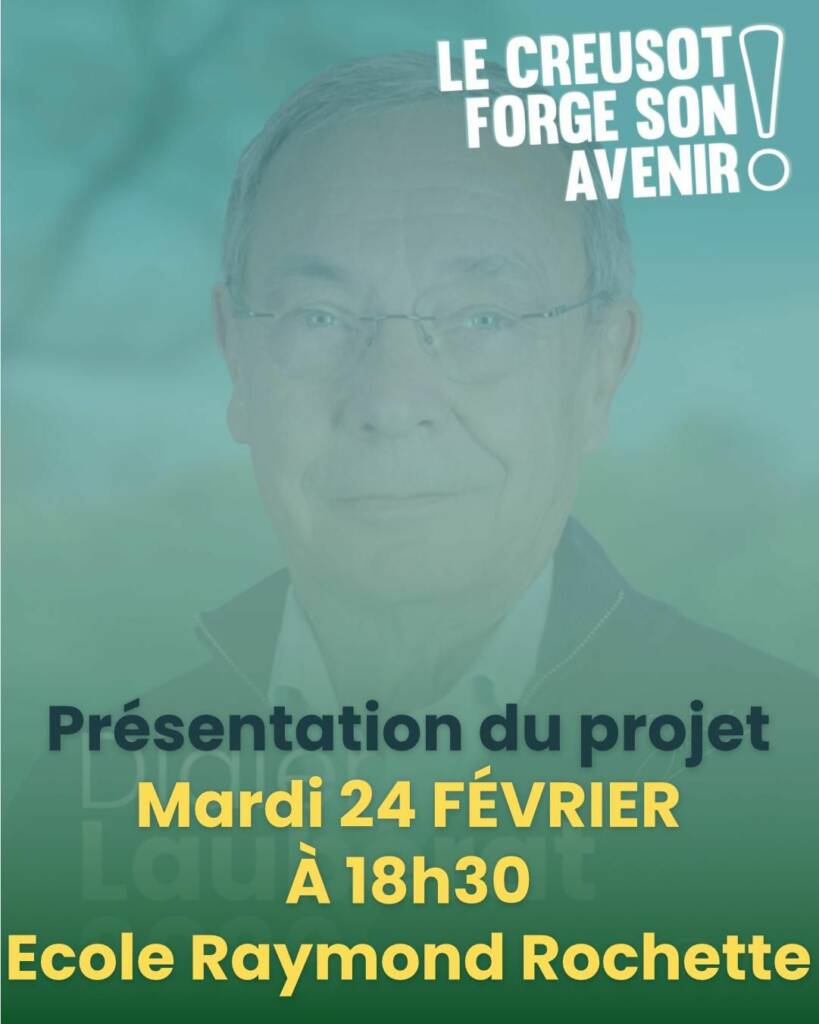 Après la présentation de la liste « Le Creusot forge son avenir », le 12 février dernier, Didier Laubérat, candidat aux élections municipales du Creusot, va dévoiler l’ensemble de son projet ce mardi 24 février à l’école Raymond Rochette à 18h30.