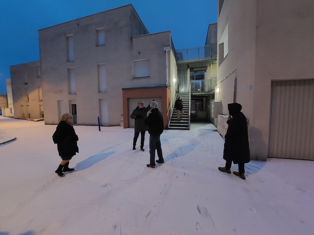 Même sous la neige, Catherine Ravier, tête de liste de « Montceau en commun », n’hésite pas à se rendre sur le terrain avec une équipe réduite et à convier la presse locale pour prendre le pouls de la vie des Montcelliens, notamment dans le domaine du logement.