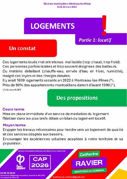 Pour LFI et Cap 2026, alors que Montceau-les-Mines comptait 1 609 logements vacants en 2022 (source INSEE), le constat est sans appel, les logements loués sont mal entretenus. « Sans compter un manque criant de communication entre les bailleurs et les locataires. Ils n’ont pas de réponse, ne voient personne, ni de l’OPAC ou d’Habellis, ni les élus de la ville. Au bout du compte, les locataires sont résignés », fait savoir la tête de liste.