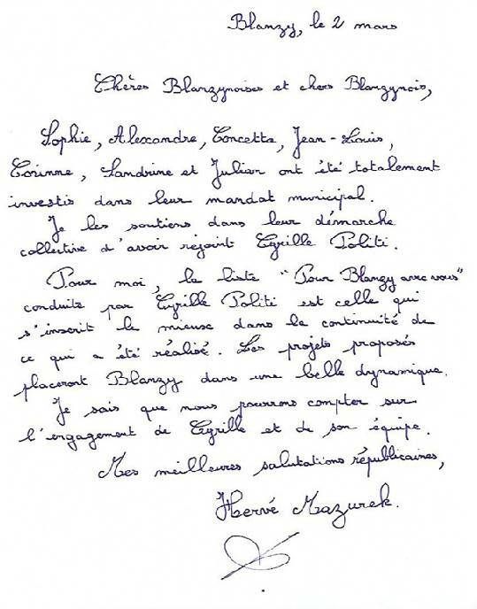 Dans une lettre manuscrite (lire ci-dessous), Hervé Mazurek, ne tergiverse pas, « pour moi, la liste conduite par Cyrille Politi est celle qui s’inscrit le mieux dans la continuité de ce qui a été réalisé ».