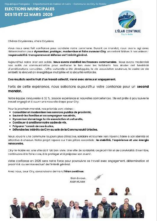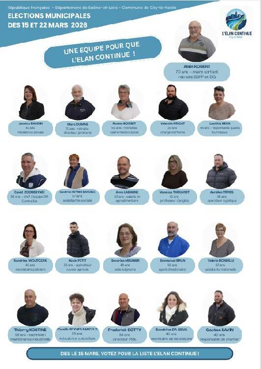 La liste « L’élan continue » conduite par Alain Robert à Ciry-le-Noble tiendra une réunion publique mardi 10 mars à 19 h au bâtiment associatif du bourg.