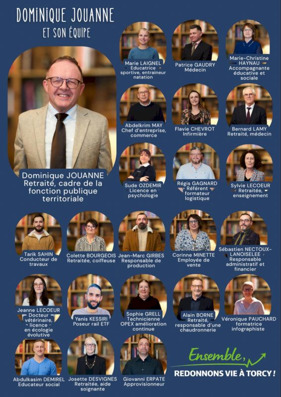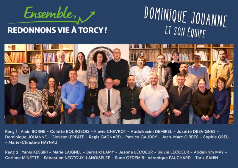 La tête de liste, Dominique Jouanne, a présenté son équipe, « Ensemble, redonnons vie à Torcy » composée de 23 colistières et colistiers, profondément ancrée à Torcy, représentative de la commune, avec un âge moyen de 51 ans, mêlant expérience, compétences et engagement durable.