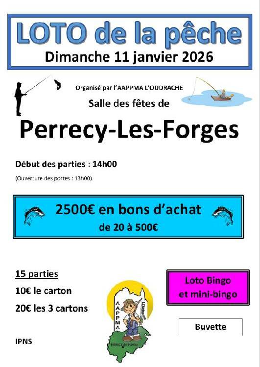 Pour commencer 2026 avec la « pêche », venez participer au loto qui aura lieu le dimanche 11 janvier 2026 a la salle des fêtes de Perrecy les Forges.