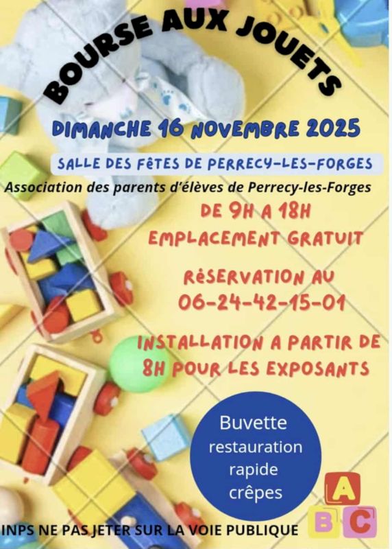 Bourse aux jouets le dimanche 16 novembre 2025, à la salle des fêtes de Perrecy-les-Forges de 9h 18h.