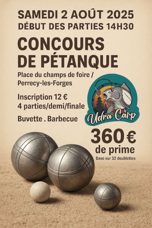 L’Uldra’Carp organise un concours de pétanque en doublette ouvert à tous, samedi 2 août 2025 à Perrecy-les-Forges sur la place du champ de foire.