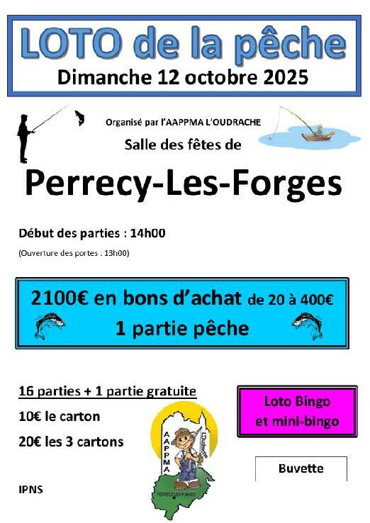 L’AAPPMA l’Oudrache organise le loto de la pêche dimanche 12 octobre 2025 à la salle des fêtes de Perrecy-les-Forges.