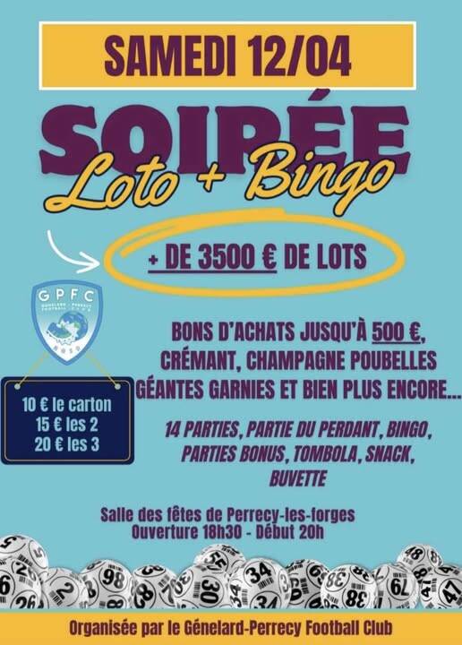 Le club de Génelard Perrecy Football Club organise samedi 12 avril 2025 son loto + bingo. Ouverture des portes de la salle des fêtes de Perrecy-les-Forges à 18h30. Première partie à 20h.
