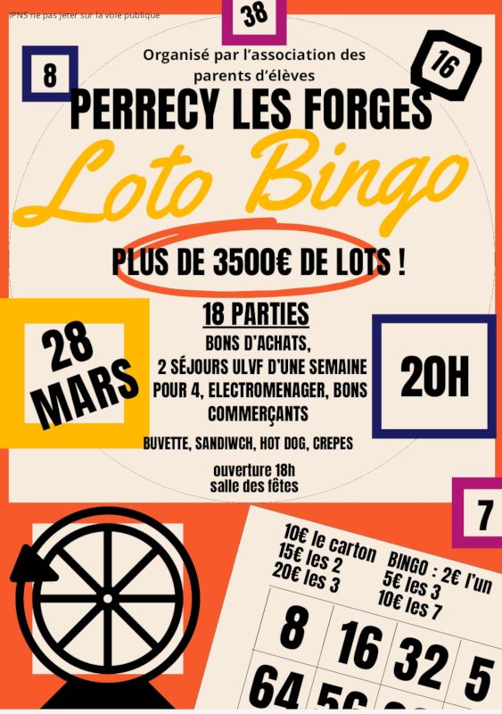 Loto organisé par l’amicale laïque section parents d’élèves le samedi 28 mars 2026 à la salle des fêtes de Perrecy les Forges.