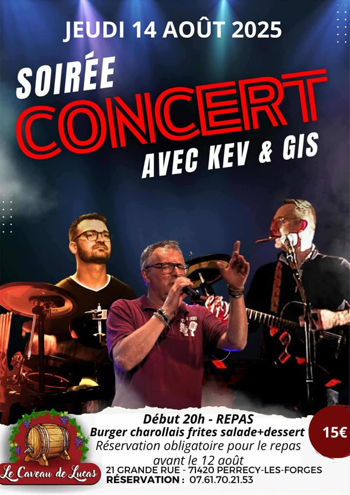 Pour bien achever cette tournée mémorable, Kev et Gis et avant de se consacrer aux 10 ans du groupe en 2026, les joyeux musiciens seront présents jeudi 14 août 2025 à Perrecy-les-Forges au caveau de Lucas. La soirée débutera à 20h par le repas (réservation obligatoire, voir sur l’affiche) avant l’entrée en scène de Kev et Gis où ils espèrent laisser une belle empreinte de bonne humeur.