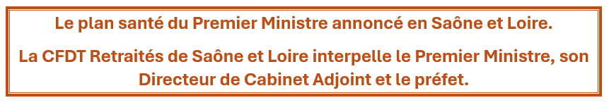 La CFDT Retraités de Saône et Loire qui a mené une grande enquête dans le premier semestre 2025 auprès de ses adhérents et de leurs proches sur l’accès aux soins, interpelle le Premier Ministre, son Directeur de Cabinet Adjoint (Louis Margueritte, ancien député de Saône et Loire) et le préfet, et leur communique les réponses obtenues par son enquête.