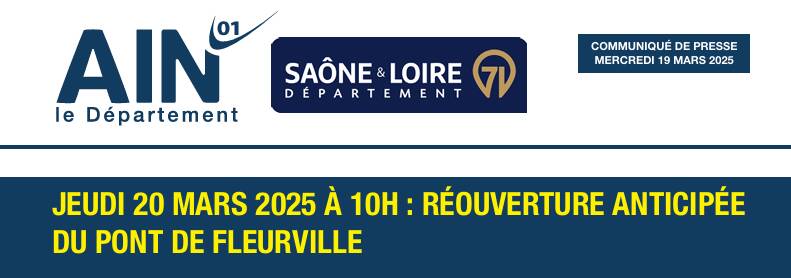 Comme annoncé par Jean Deguerry, Président du Département de l’Ain, lors de la manifestation de dimanche dernier qui a rassemblé de nombreux Aindinois et Saône-et-Loiriens en faveur d’un projet de nouvel ouvrage sur la Saône, le pont de Fleurville rouvrira de manière anticipée, ce jeudi 20 mars à 10h, pour les véhicules de moins de 3,5 tonnes. Le nécessaire a, en effet, été fait auprès des entreprises concernées pour gagner 15 jours sur le planning prévisionnel de cette fermeture, que tout le monde a subie.