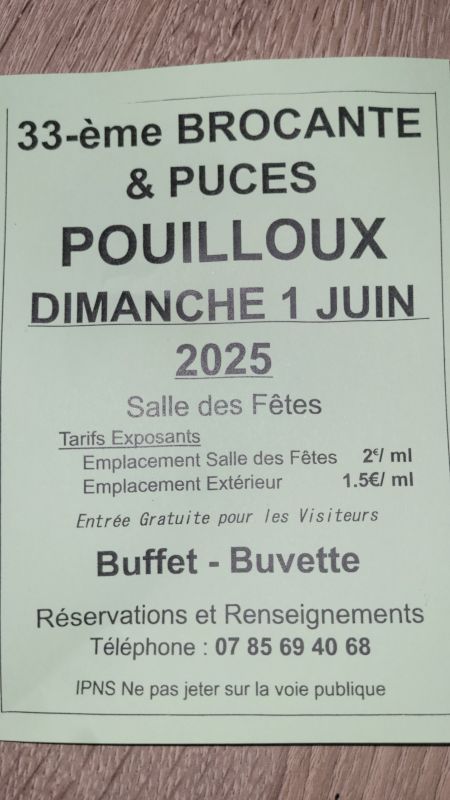 La 33e brocante de la Saint Hubert se déroulera le dimanche 1 juin 2025 à la salle des fêtes de Pouilloux et sur le parking.