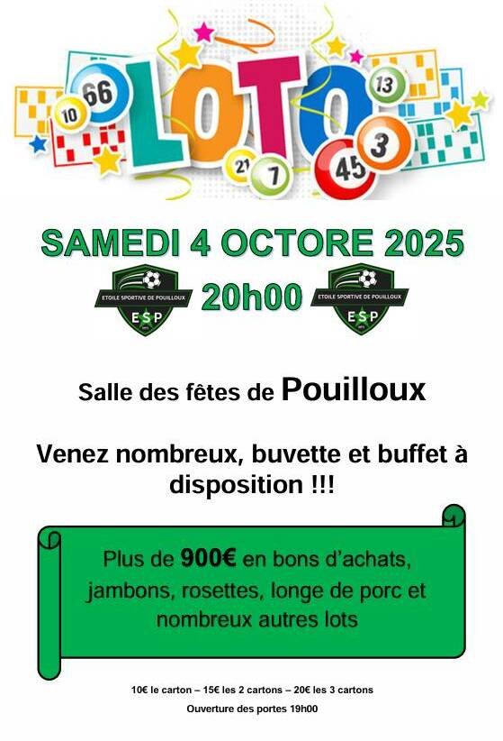 Comme le veut la tradition, l’Etoile Sportive de Pouilloux commence la saison avec son premier loto qui aura lieu samedi 4 octobre 2025 à 20h à la salle des fêtes de Pouilloux.