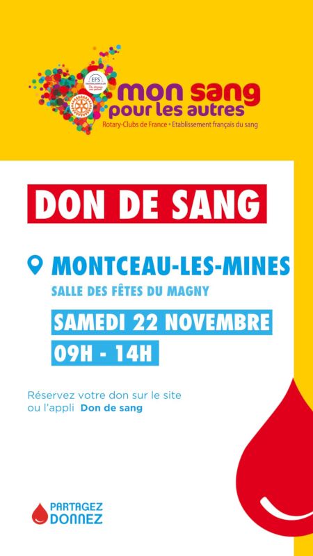 Communiqué – Le Rotary Club de Montceau, l’Etablissement français du sang (EFS) et l’Association des donneurs de sang bénévoles du Bassin minier (ADSBBM) organisent depuis plusieurs années une journée exceptionnelle de don de sang avec animations et collation gourmande.