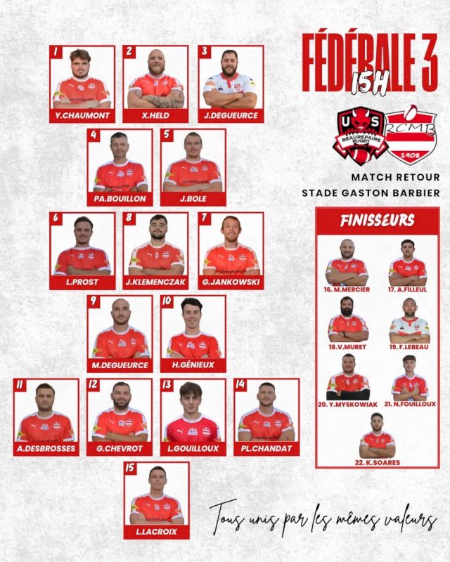 Cet après-midi (coup d’envoi à 15h), le RCMB se présentera sans son 3e ligne Victor Tulinski qui s’est blessé à la cheville au match aller. Il sera remplacé par L. Prost. Autre changement, Loris Lacroix revient à l’arrière, Louis Gouilloux repasse au centre et pousse Antoine Desbrosses à l’aile. Dans cette configuration, le RCMB espère prendre de vitesse la garde beaurepairoise, notamment en passant sur les extérieurs.