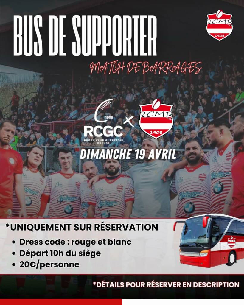 Le RCMB entre dans la phase décisive de sa saison ! Pour le match de barrages contre le RCGC (Rugby Club Guéretois Creuse), le club organise un grand déplacement de supporters le dimanche 19 avril.