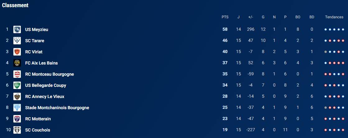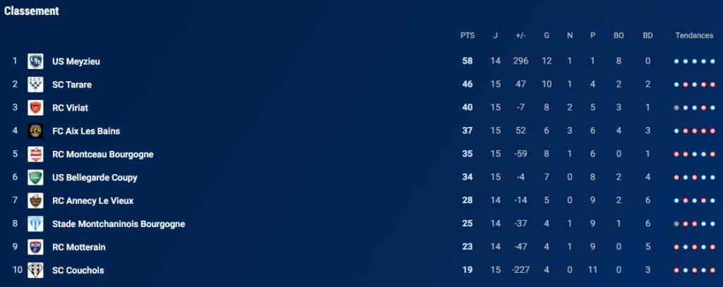 Le miracle n’a pas eu lieu le week-end dernier à Aix-les-Bains où les Montcelliens se sont inclinés 27 à 8. Une défaite qui place le RCMB à la 5e place de la poule 3, juste derrière les Aixois. Ils espéraient tant faire un coup pour rester dans le wagon de la qualification, qu’ils vont devoir cravacher dur pour déloger les Savoyards de la quatrième place.