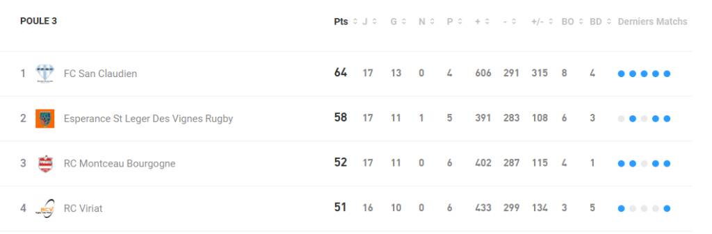 Mais il y a un mais, même plusieurs. Déjà, le coach n’a toujours pas digéré la défaite à domicile contre Genlis (25 – 14) le 15 décembre dernier. « Aujourd’hui, nous serions plus sereins pour la qualification » précise-t-il. Et puis, il faut tenir compte de ce match non joué entre Montchanin et Viriat qui ne se disputera pas mais qui verra chacun des clubs prendre deux points _ une histoire de péréquation _ de plus au classement. En conséquence, Viriat occupe la 3e place avec 53 points juste devant Montceau, 52 points.