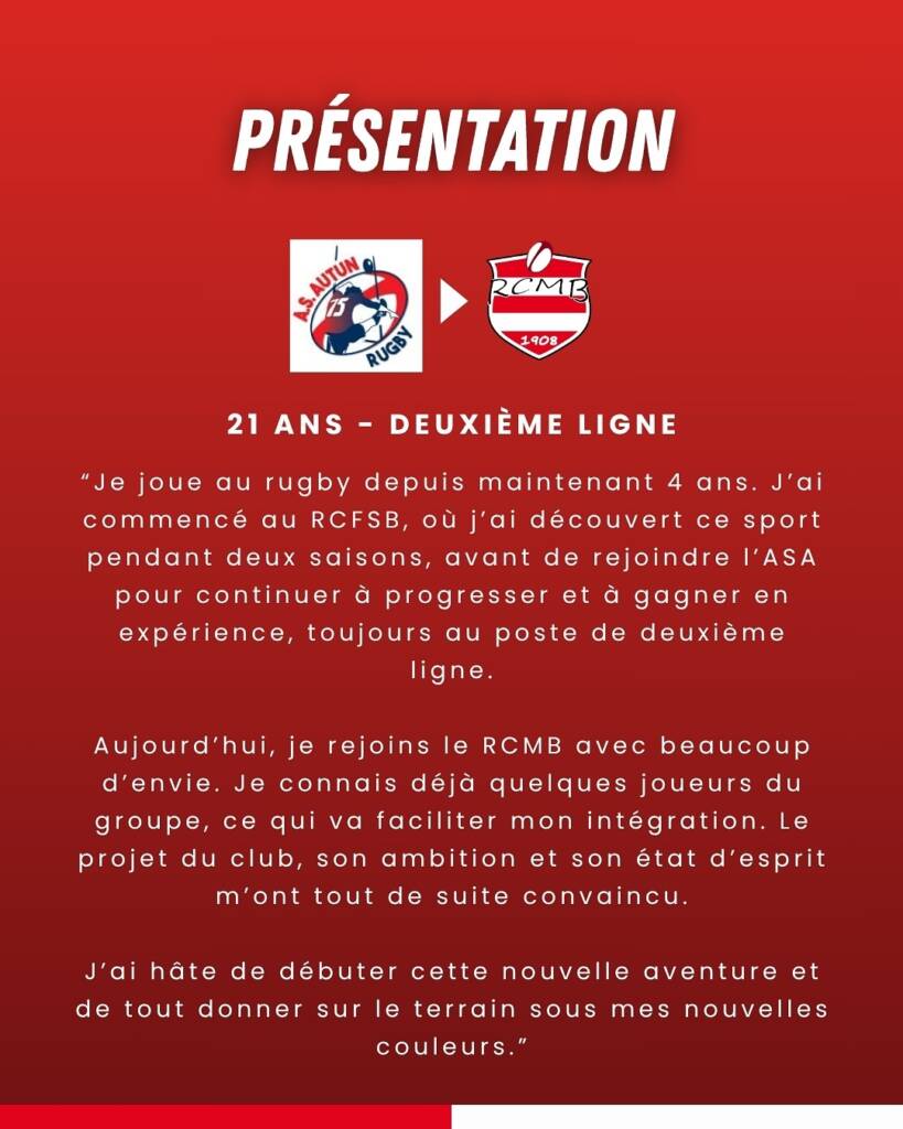 Pour rappel, le RCMB a déjà enrôlé deux joueurs du Club Olympique Creusot (F2), Léo Brachet (ailier) et Mehdi Mansour (centre); deux autres du RT Châlonnais (F2), Jules Goux (2e/3e ligne) et Antoine Linas (arrière) sans oublier Valentin Laupin (arrière) du XIV Charolais.