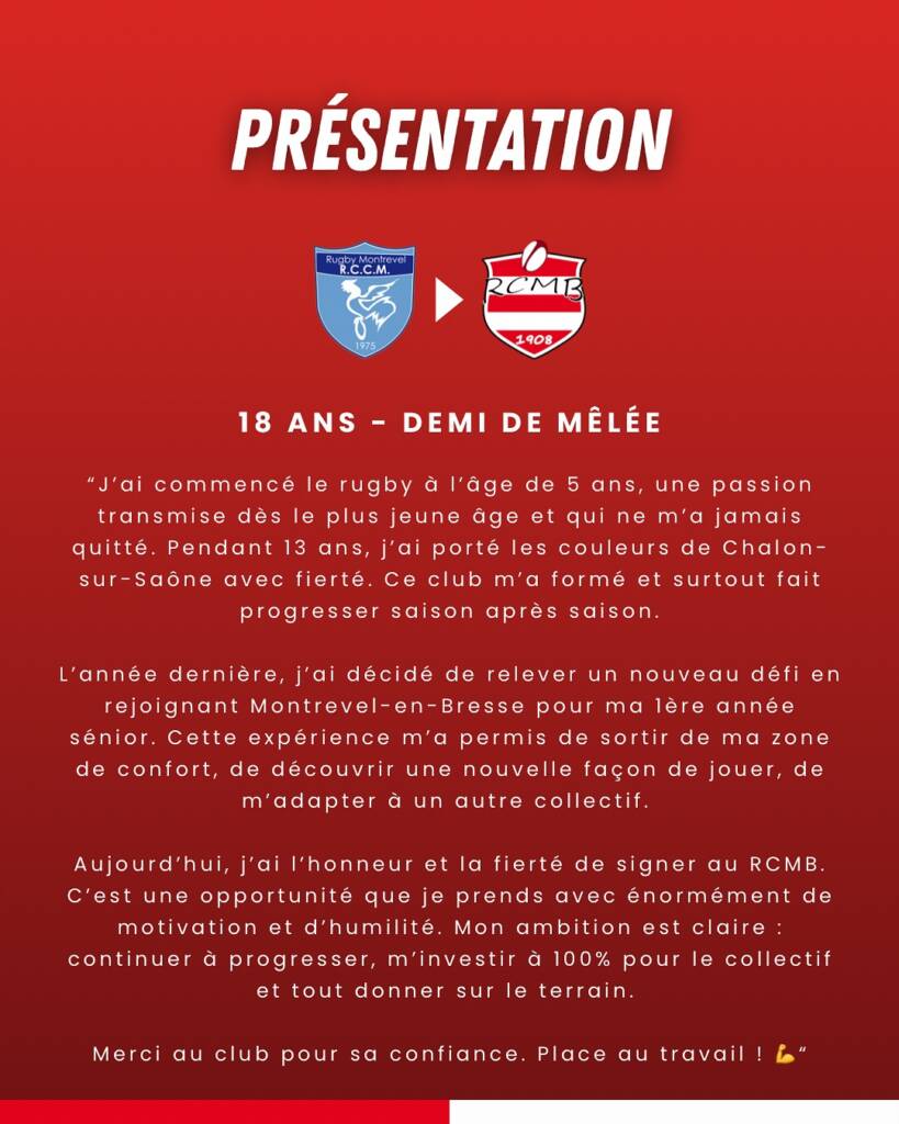 Ce jeune joueur de 18 ans à l’avenir prometteur, évolue au poste de demi-de-mêlée. Il a débuté sa carrière au RC Chalon avant de rejoindre Montrevel-en-Bresse pour sa première saison chez les seniors.