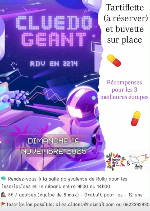 L’association Ailes Aident en collaboration avec l’association Imagin’arts organise, à nouveau, un Cluedo Géant le dimanche 16 novembre 2025 à la salle polyvalente de Rully.