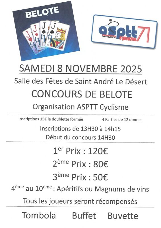L’ASPTT Chalon propose à Saint André le Désert (Entre Salornay et Saint Bonnet de Joux) son deuxième concours de belote à la salle des fêtes, samedi 8 novembre 2025.