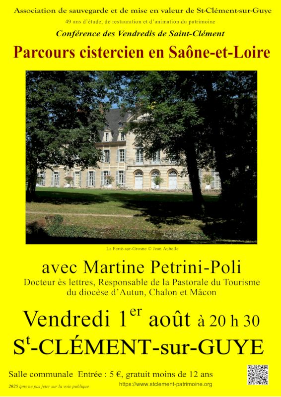 Le Parcours cistercien en Saône-et-Loire évoque l’histoire de la fondation de la 1ère fille de l’abbaye de Cîteaux, l’abbaye de la Ferté-sur-Grosne en 1113 qui se développe jusqu’au XVIIIe siècle : elle crée l’abbaye de Maizières en 1125, essaime en Italie, en Espagne et même jusqu’en Syrie. Les cisterciens, ordre réformé de Cluny, veulent retourner aux origines de la vie monastique bénédictine de prière et de travail : ora et labora. Leurs abbayes situées dans des « déserts », lieux à l’écart, sont entourées par la nature, qu’elles façonnent en paysage rural de terres cultivées, granges, vignes, étangs, canaux… Cet ordre qui a tant compté pour l’histoire de l’Europe au Moyen Âge poursuit sa tradition vivante de labeur et de recueillement dans notre XXIe siècle. Nous découvrirons ainsi les églises rurales d’influence cistercienne avec leurs caractéristiques propres, à la transition entre l’art roman et l’art gothique.