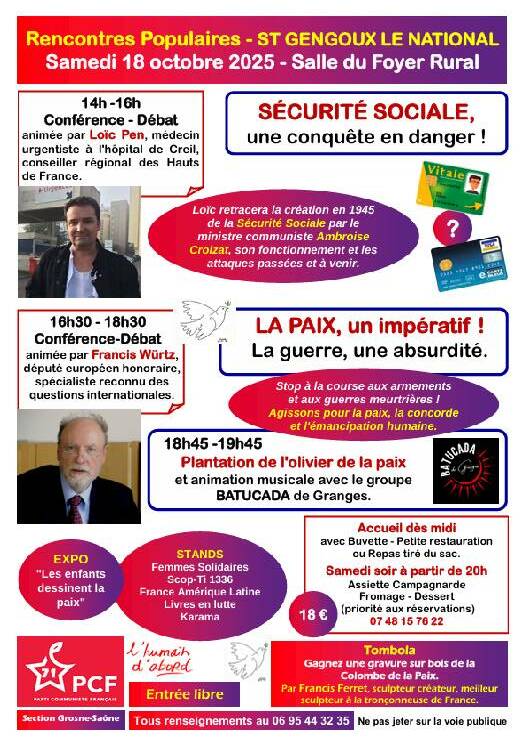 Les rencontres populaires organisées par la section de Saône-et-Loire du parti communiste français, samedi 18 octobre 2025 au foyer rural de Saint-Gengoux-le-National , montrent à quel point, l’inquiétude est grande chez les communistes sur la santé, la sécurité sociale et sur les questions internationales.