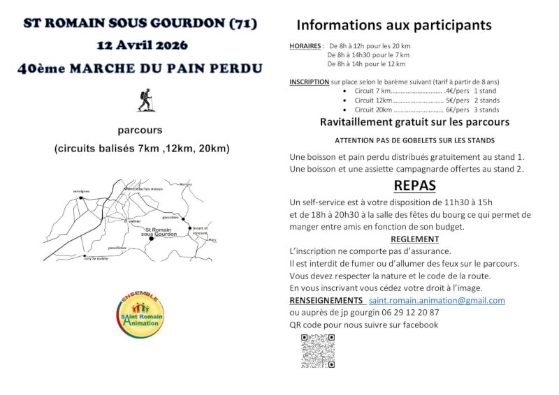 Le 12 avril 2026 si vous aimez marcher c’est à Saint-Romain-sous-Gourdon qu’il faut venir car ce sera notre 40e marche du pain perdu. Donc depuis 40 ans croyez bien que nous sommes rodés pour bien vous accueillir.
