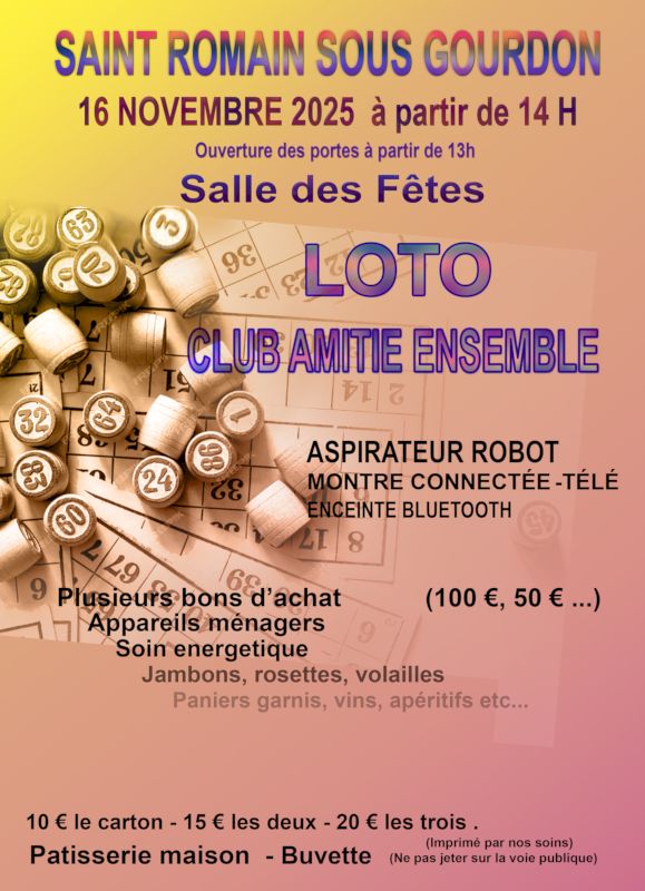 Le loto annuel organisé par le club Amitié Ensemble ce dimanche 16 novembre 2025 à la salle des fêtes de Saint-Romain-sous-Gourdon.