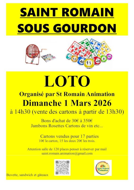 Saint Romain animation organise un loto, dimanche 1er mars 2026 à la salle des fêtes de Saint-Romain-sous-Gourdon.